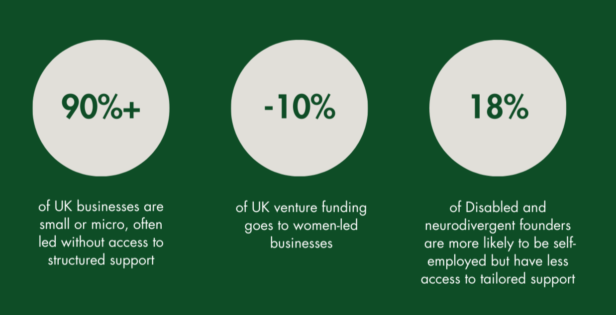 Through a combination of financial support, capacity-building programmes, and expert-led mentoring, we work alongside founders to remove barriers, unlock opportunity, and support long-term growth.